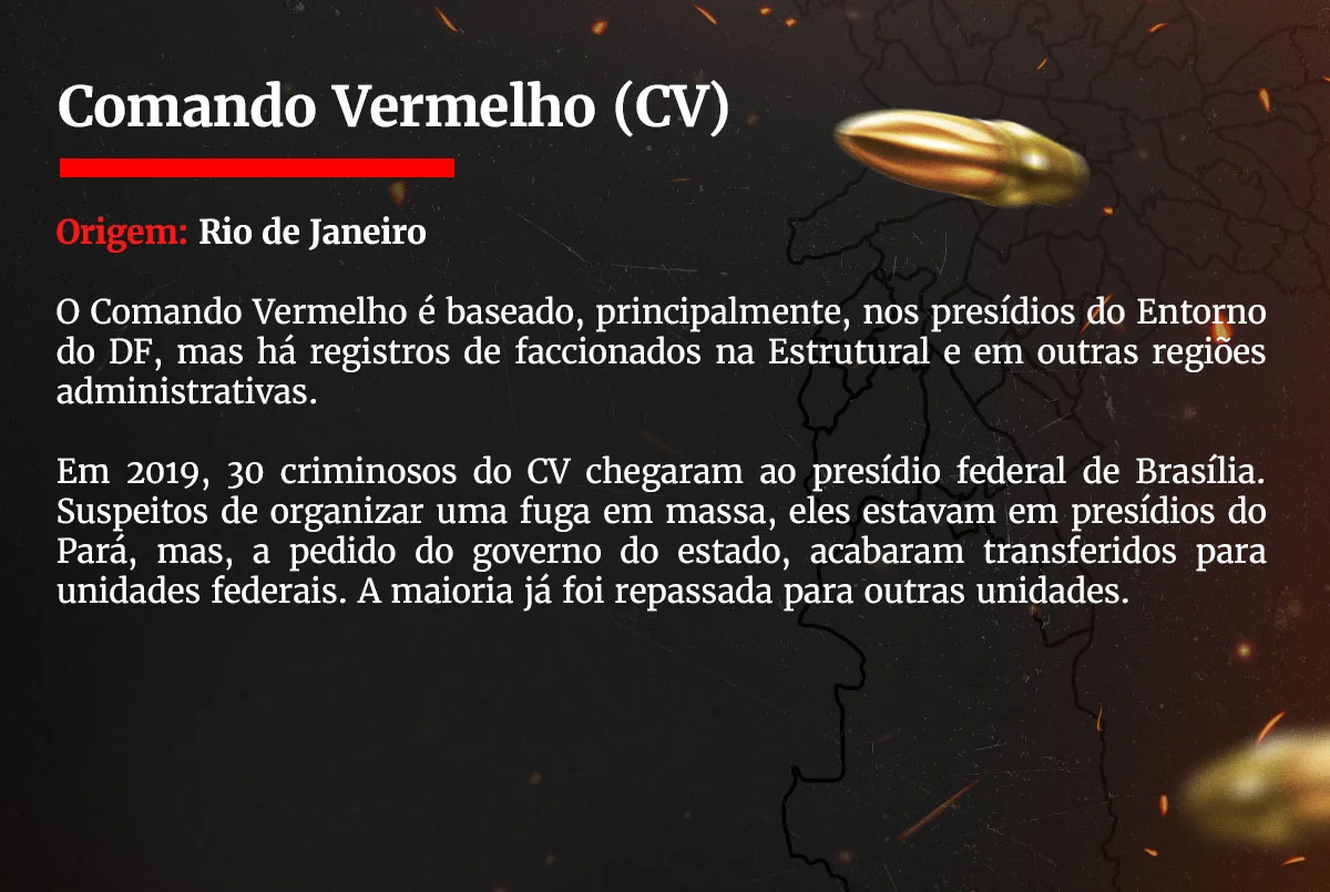 Apesar da operação ter acontecido no Rio de Janeiro, as maiores facções crimonosas do país — CV, e o Primeiro Comando da Capital (PCC) — , estão espalhadas no Brasil inteiro com seus faccionados, assim como no Distrito Federal. Entretanto, apesar do registro de atuação dos grupos na capital, o quadradinho segue fora da lista de territórios dominados pelas grandes facções do crime organizado.