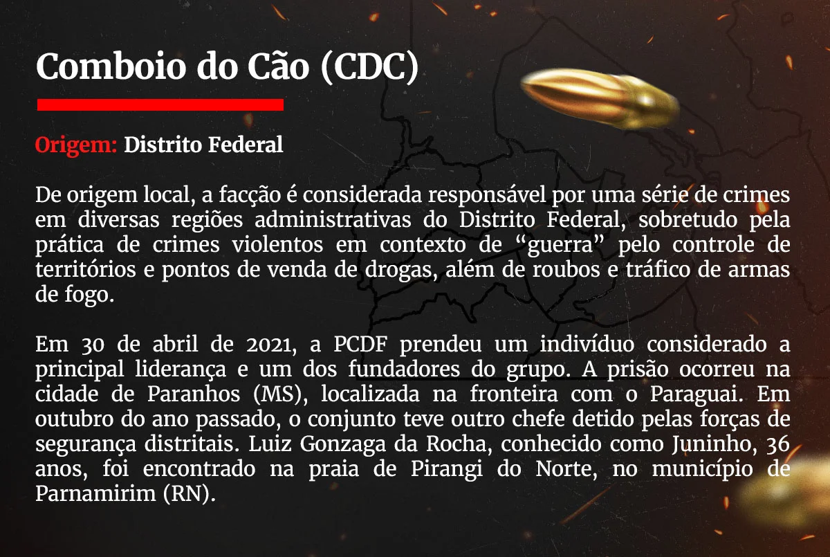 O principal atuante na capital é o Comboio do Cão (CDC). Por alguns anos, o grupo criminoso, que se originou no Distrito Federal, atuou de maneira quase isolada dentro dos limites da capital da República. No entanto, as facções nacionais aumentaram sua teia de influência e chegaram a Brasília e seus arredores, e tentam a continuar a crescer.