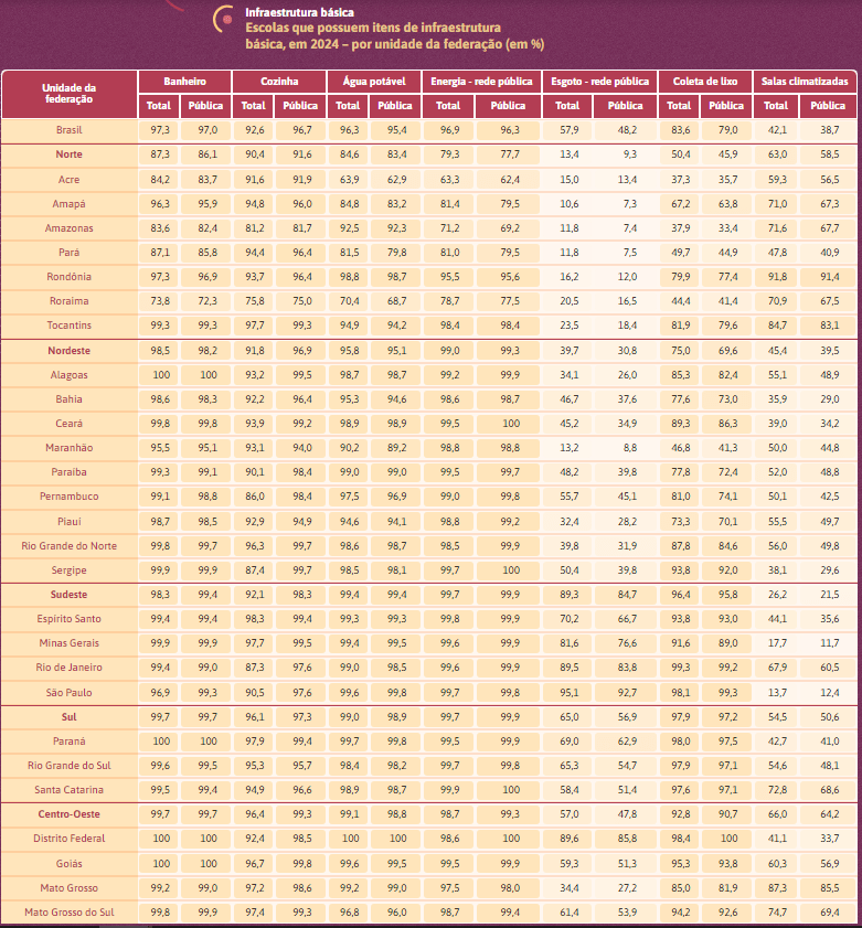 O Brasil ainda enfrenta desafios significativos na oferta de infraestrutura básica nas escolas públicas, segundo dados divulgados nesta quinta-feira (25) pelo Anuário Brasileiro da Educação Básica 2025, elaborado pelo Todos Pela Educação, Fundação Santillana e Editora Moderna. Menos da metade das unidades tem acesso a esgoto, mais de 20% não contam com coleta de lixo e apenas 38,7% das salas de aula têm algum tipo de climatização, como ar-condicionado ou aquecedor. Minas Gerias apresenta o menor índice do país (11,7%), enquanto Rondônia lidera com 91,4%.
