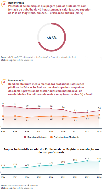 Nos anos iniciais do ensino fundamental, 75,3% dos professores possuem licenciatura ou complementação pedagógica em 2024, contra 56,6% em 2014. No entanto, 19,4% dos docentes da educação infantil ainda não têm diploma superior. Quanto à remuneração, 68,5% dos municípios pagavam em 2023 pelo menos o piso nacional do magistério para jornadas de 40 horas semanais, no valor de R$ 4.420,55.