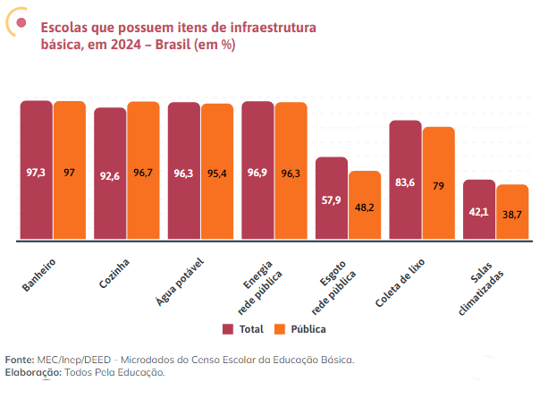 O Brasil ainda enfrenta desafios significativos na oferta de infraestrutura básica nas escolas públicas, segundo dados divulgados nesta quinta-feira (25) pelo Anuário Brasileiro da Educação Básica 2025, elaborado pelo Todos Pela Educação, Fundação Santillana e Editora Moderna. Menos da metade das unidades tem acesso a esgoto, mais de 20% não contam com coleta de lixo e apenas 38,7% das salas de aula têm algum tipo de climatização, como ar-condicionado ou aquecedor. Minas Gerias apresenta o menor índice do país (11,7%), enquanto Rondônia lidera com 91,4%.