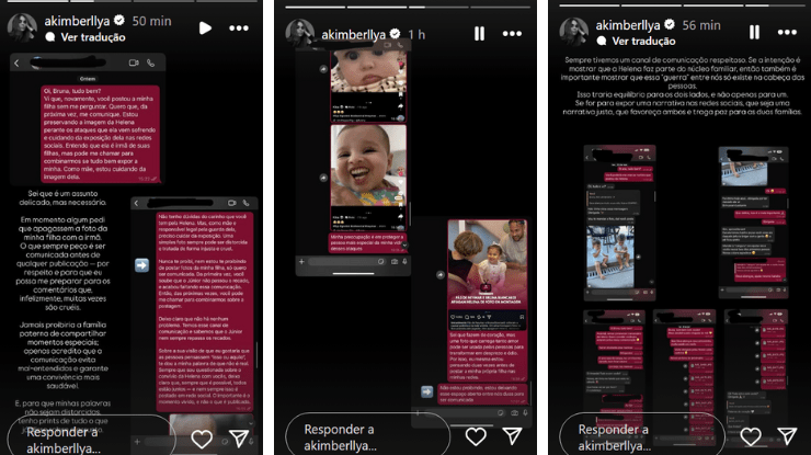 No print da discussão, Amanda Kimberlly pede que seja comunicada antes de fotos de sua própria filha sejam publicadas. “Vi que, novamente, você postou a minha filha sem me perguntar. Quero que, da próxima vez, me comunique. Estou aproveitando a imagem da Helena perante os ataques que ela vem sofrendo e cuidando da exposição dela nas redes sociais. Entendo que ela é irmã da suas filhas, mas pode me chamar para combinarmos se tudo bem por ela e por mim. Como mãe, estou cuidando da imagem dela”, começou ela no texto enviado para Bruna.