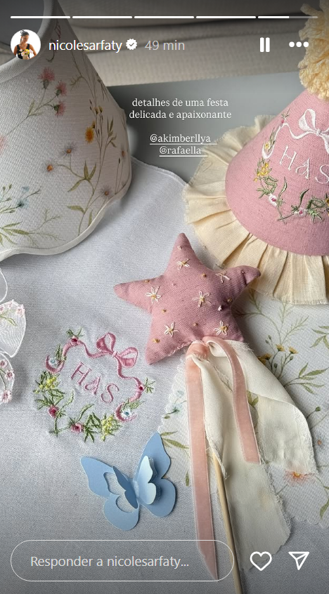 Na imagem compartilhada, a decoradora aposta em detalhes em rosa, branco e azul, com temas envolvendo flores e borboletas. Nos últimos dias, a influenciadora revelou em suas redes sociais que o tema da festa será “Jardim”.