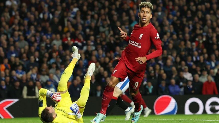 8 de 12Roberto Firmino, do Liverpool, comemora depois de marcar o segundo gol de sua equipe durante a partida do grupo A da Liga dos Campeões da UEFA contra o Rangers FC em 12 de outubro de 2022 • Ian MacNicol/Getty Images