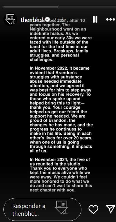 Segundo o comunicado divulgado nas redes sociais da banda, os músicos se reuniram em novembro de 2024 para trabalhar em novas canções. O período longe dos holofotes foi, de acordo com a publicação, necessário para a recuperação de Brandon Fried.