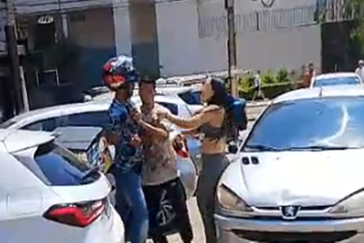 Nas imagens, é possível ver o automóvel parado atrás da moto, em um estacionamento próximo de onde a briga iniciou. Eles deixam os veículos e iniciam uma discussão verbal exaltada e com xingamentos.