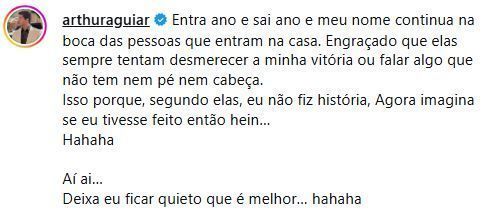 No Instagram, uma página repercutiu o momento e nos comentários, Arthur Aguiar se pronunciou. “Entra ano e sai ano e meu nome continua na boca das pessoas que entram na casa. Engraçado que elas sempre tentam desmerecer a minha vitória ou falar algo que não tem nem pé nem cabeça”, iniciou ele.