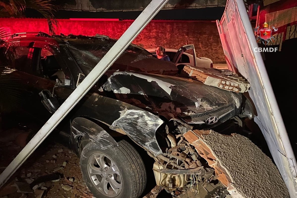 O Corpo de Bombeiros Militar do Distrito Federal (CBMDF) atendeu a ocorrência mobilizando duas viaturas de socorro e se deparou com o Hyundai Tucson, de cor preta, que havia acabado de derrubar um muro e um portão de uma casa.