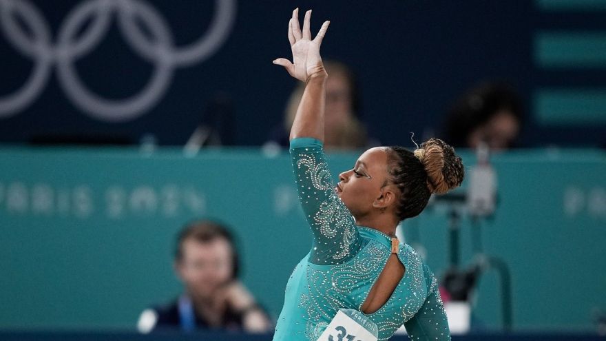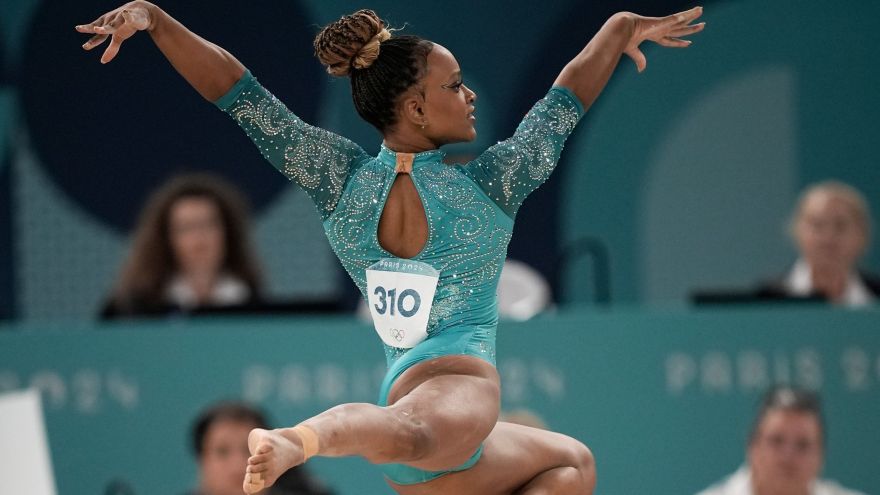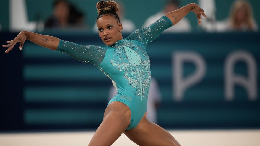 1 de 9Rebeca Andrade durante sua apresentação no solo da ginástica artística em Paris 2024 • Jamie Squire/Getty Images