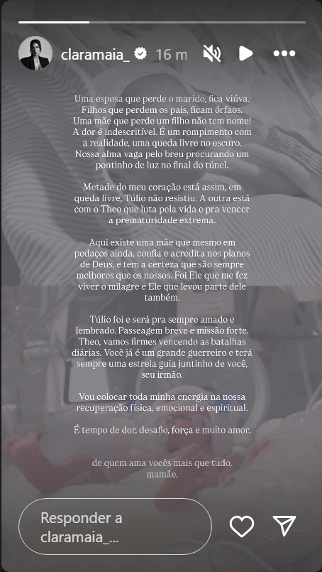 No fim do relato, a influenciadora menciona como Túlio sempre foi amado e lembrado. “Theo, vamos firmes vencendo as batalhas diárias. Você já é um grande guerreiro e terá sempre uma estrela guia juntinho de você, seu irmão. Vou colocar toda minha energia na nossa recuperação física, emocional e espiritual. É tempo de dor, desafio, força e muito amor”, finaliza.