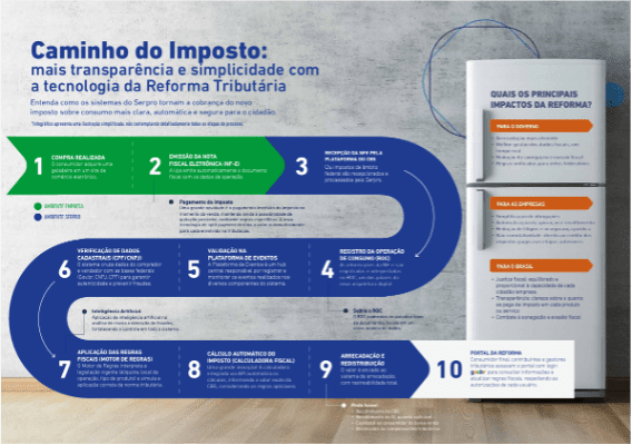 Fonte: SERPRO. Reforma Tributária do Brasil: transformação que constrói o futuro. Disponível em: chrome-extension://efaidnbmnnnibpcajpcglclefindmkaj/https://www.serpro.gov.br/arquivos/infografico-digital-reforma-tributaria.pdf. Acesso em 13.10.2025