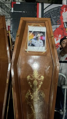 3 de 11Torcida do São Paulo leva caixão com foto de Julio Casares a protesto • Raul Moura/CNN Brasil
