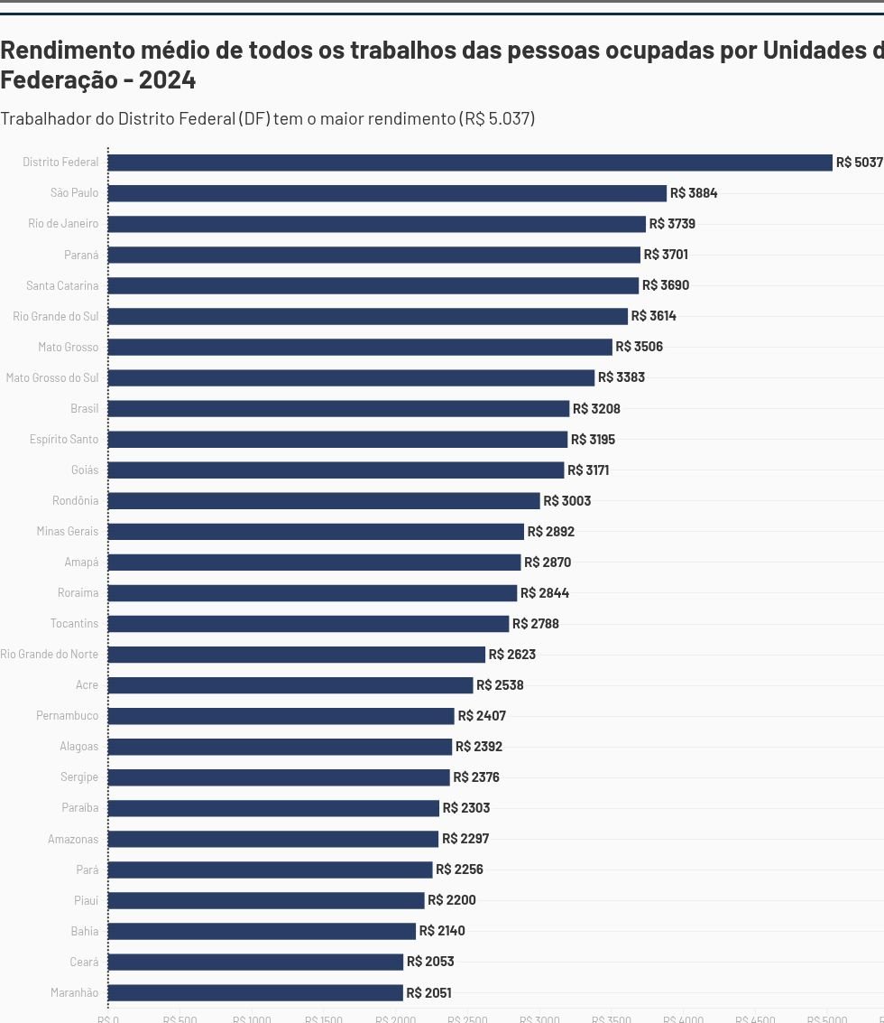 Segundo IBGE, Distrito Federal registrou em 2024 o maior rendimento médio dos trabalhadores ocupados de R$ 5.037, seguido por São Paulo, onde moradores tem rendimento de R$ 3.884  Macroeconomia, IBGE (Instituto Brasileiro de Geografia e Estatística), Rendimentos CNN Brasil