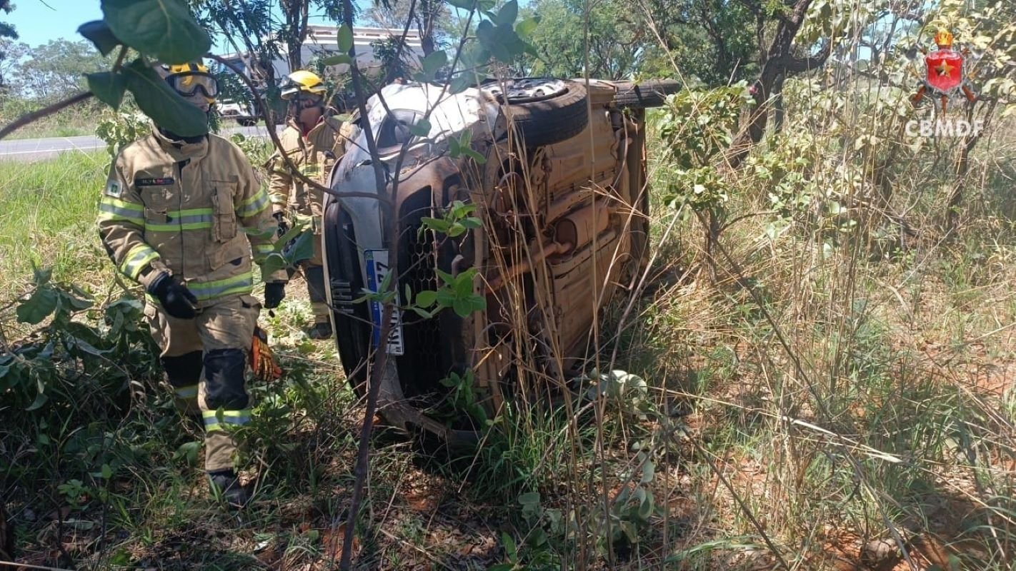 Segundo o Corpo de Bombeiros do Distrito Federal (CBMDF), as duas vítimas estavam dentro do carro, que saiu da pista e capotou às margens da via.