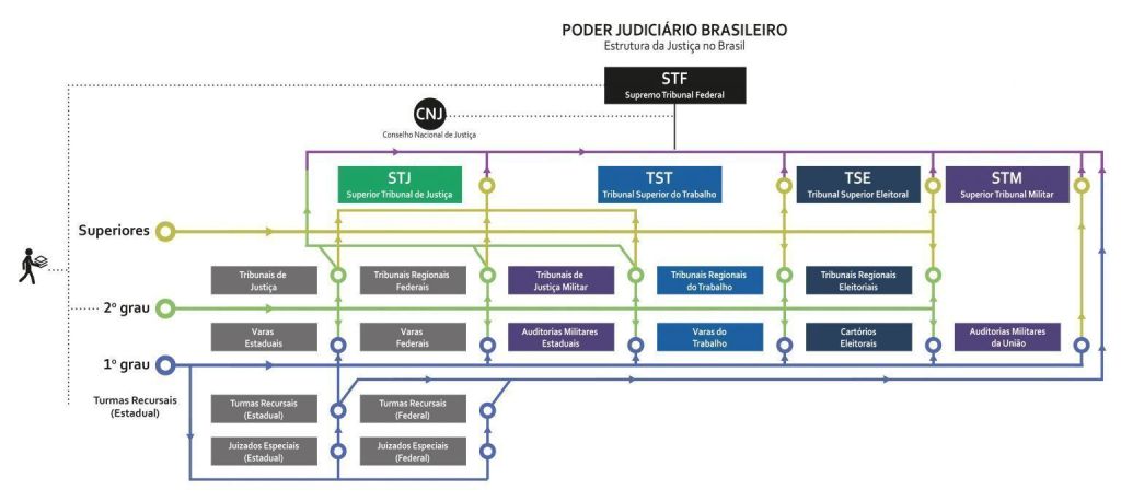 Abaixo dos Tribunais Superiores, encontram-se os tribunais e as varas, podendo ser federais ou estaduais (confira os detalhes no fluxograma abaixo).
