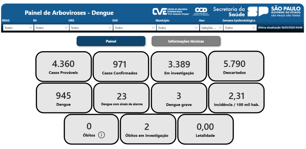 Veja os índices no Painel de Arboviroses (Dengue) de São Paulo: