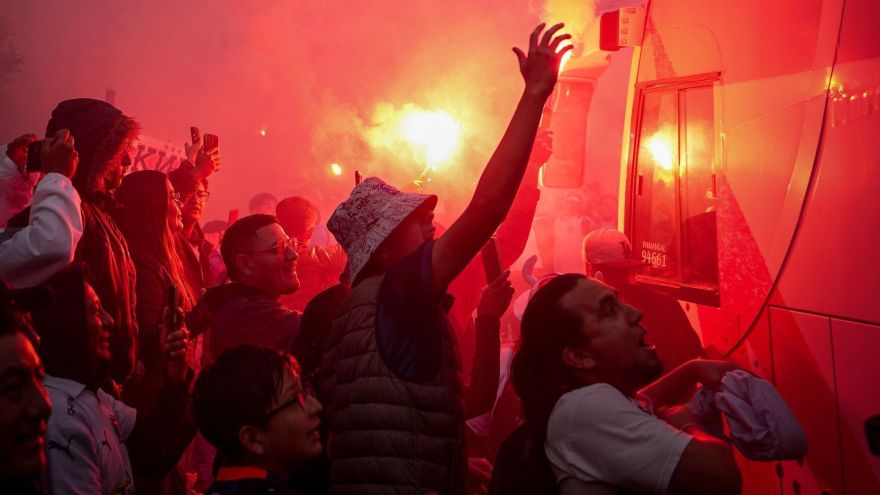 Torcedores da LDU recebem o ônibus do elenco antes do jogo contra o Palmeiras • Reprodução/X @LDU_Oficial