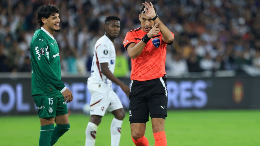 Árbitro Facundo Tello aponta que Andreas Pereira cometeu pênalti em LDU x Palmeiras pela Libertadores • Franklin Jacome/Getty Images