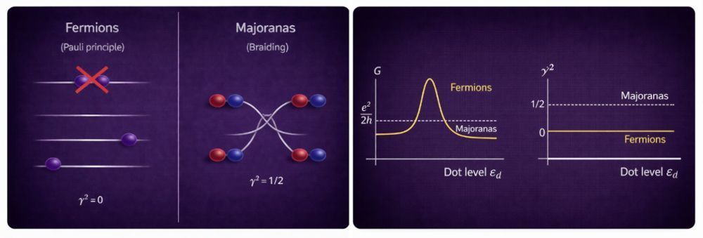 Figura 2: a) Ilustração do princípio de Pauli para férmions usuais: dois férmions não podem ocupar o mesmo estado quântico. Esse conceito de ocupação não existe para férmions de Majorana com energia zero em matéria condensada. Esses estados de Majorana apresentam uma característica fundamentalmente distinta dos férmions usuais: seus estados quânticos se entrelaçam de forma não trivial quando são trocados de posição, tornando a informação codificada nos mesmos imune às perturbações. b) Em contraste com os férmions usuais, que exibem uma condutância ressonante (pico), a condutância G para um modo de Majorana apresenta um platô que sinaliza o estado topológico com γ2 = ½ • Poliana Heiffig Penteado/ChatGPT