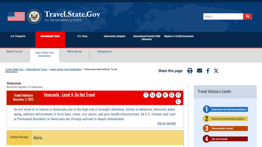 O governo dos Estados Unidos atualizou na quarta-feira (3) as orientações sobre viagens de cidadãos americanos para a Venezuela, em meio ao aumento da tensão entre os dois países.