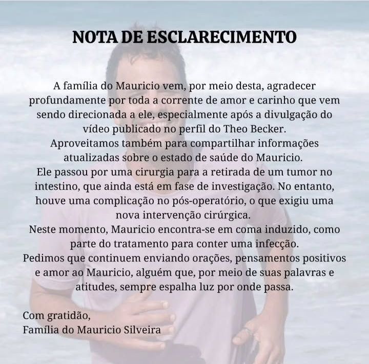 “Ele passou por uma cirurgia para a retirada de um tumor no intestino, que ainda está em fase de investigação. No entanto, houve uma complicação no pós-operatório, o que exigiu uma nova intervenção cirúrgica. Neste momento, Maurício encontra-se em coma induzido, como parte do tratamento para conter uma infecção”, diz o texto.