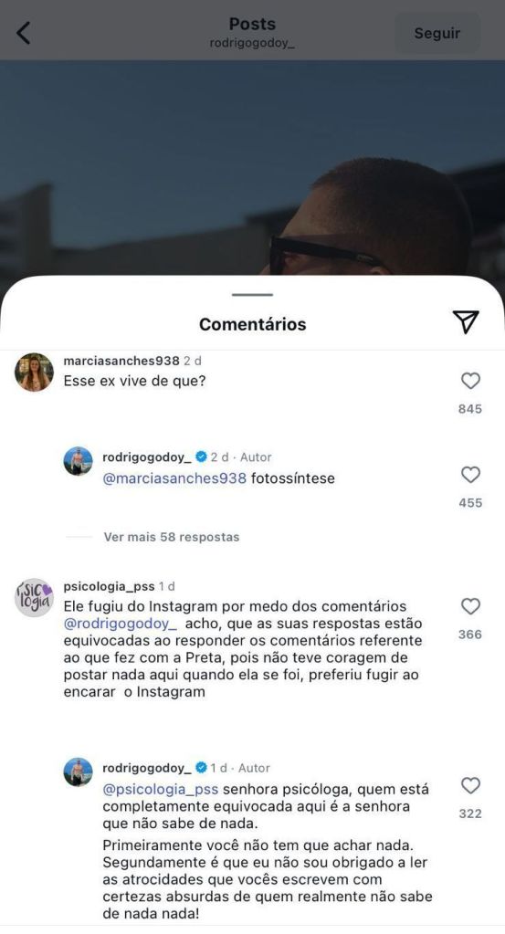 O personal trainer Rodrigo Godoy, 36, rebateu algumas críticas recebidas em seu perfil no Instagram ao se manifestar, pela primeira vez, no último domingo (3), após a morte da cantora Preta Gil, 50, com quem foi casado entre 2015 e 2023. A artista colocou um ponto final no matrimônio quando descobriu que estava sendo traída durante o início de seu tratamento contra um câncer no intestino.