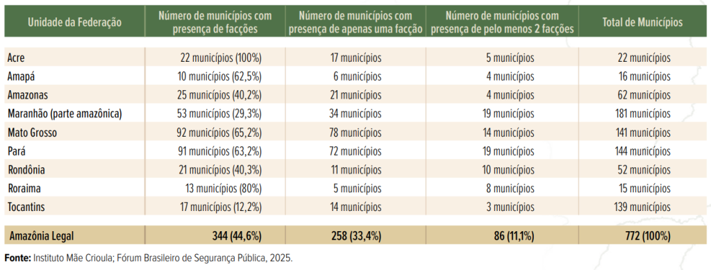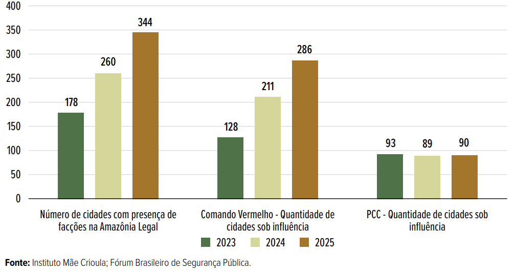 De acordo com a pesquisa, das 772 cidades da Amazônia Legal, 178 cidades tinham influência de facções criminosas em 2023; o número aumentou para 260 em 2024. O apontamento de 2025 identificou que 344 cidades possuem presença de facções.