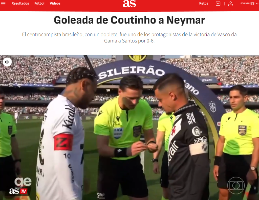 O Diário As, da Espanha, deu destaque ao duelo Neymar x Coutinho, que são amigos há 20 anos. O meia do Vasco fez dois gols na goleada deste domingo.