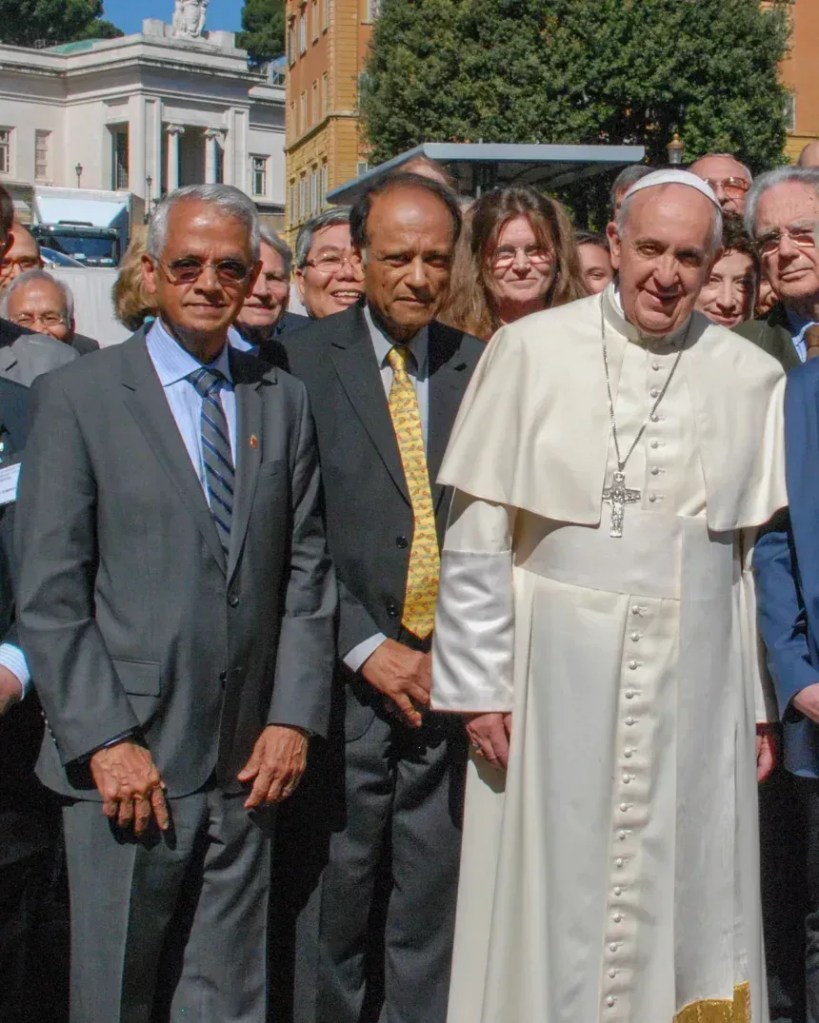 Ramanathan (à esquerda) com o Papa Francisco e outros pesquisadores após um workshop conjunto da Pontifícia Academia das Ciências e da Pontifícia Academia das Ciências Sociais em 2014 no Vaticano • Lorenzo Rumori