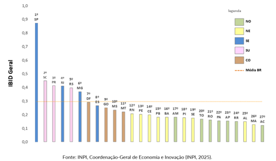 O gráfico abaixo mostra os resultados gerais do IBID 2025. É notória a grande discrepância entre São Paulo e os demais estados, com índice 3 vezes acima da média nacional. Se comparado com o GII Global, São Paulo (líder da série histórica do INPI há 10 anos[2]) equivaleria à Suíça, que se mantém na dianteira há 15 anos.