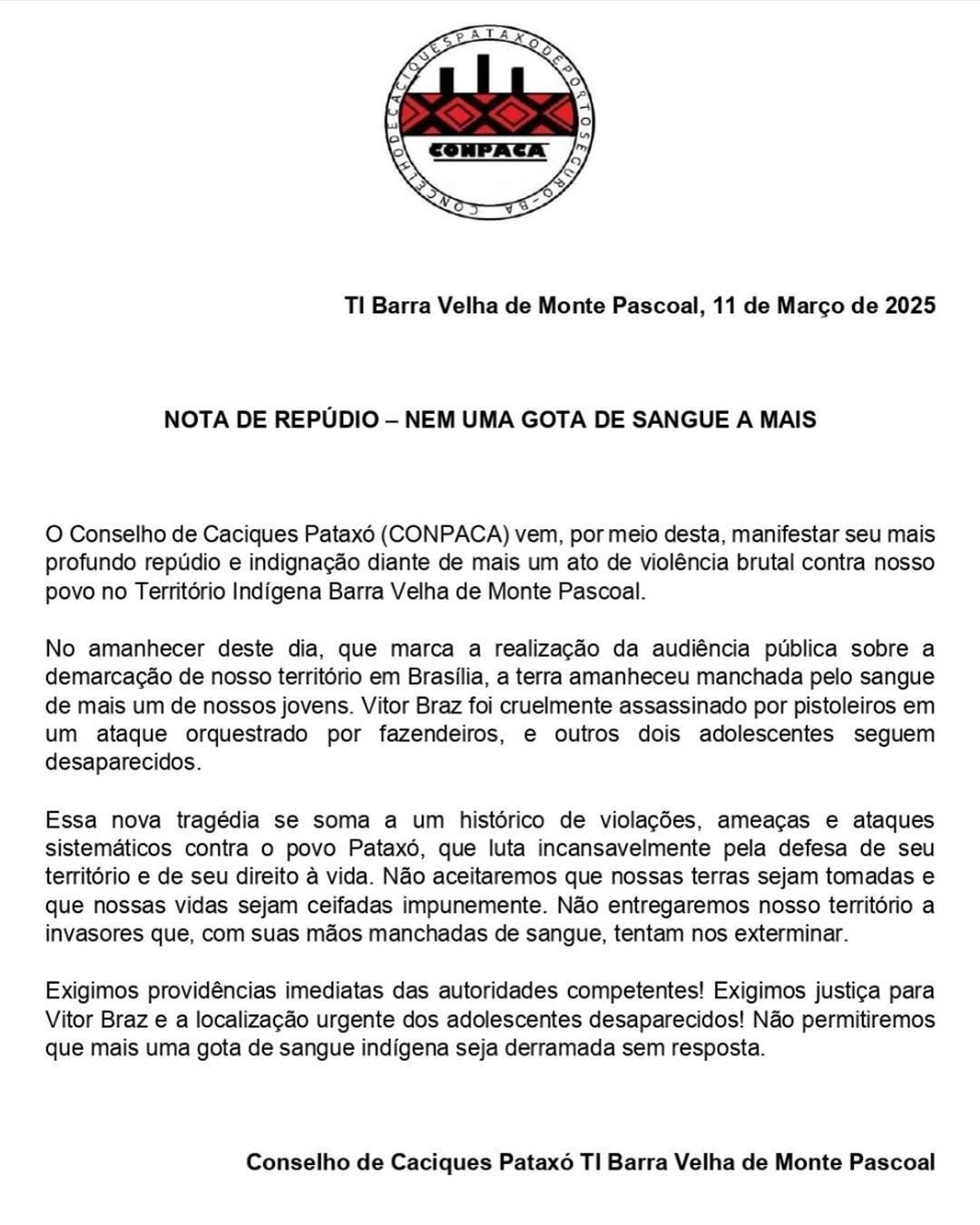 NOTA DE REPÚDIO • Conselho de Caciques Pataxó TI Barra Velha de Monte Pascoal.