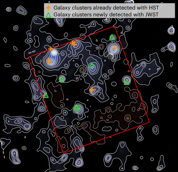 Comparação de aglomerados de galáxias detectados pelo Hubble (HST) e o James Webb (JWST) • Nature Astronomy