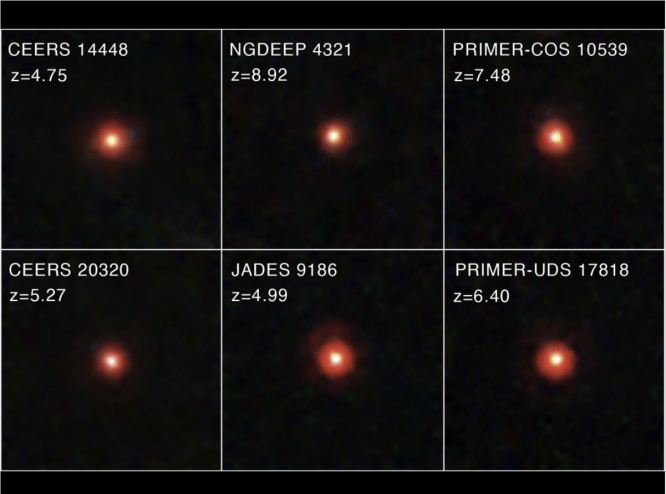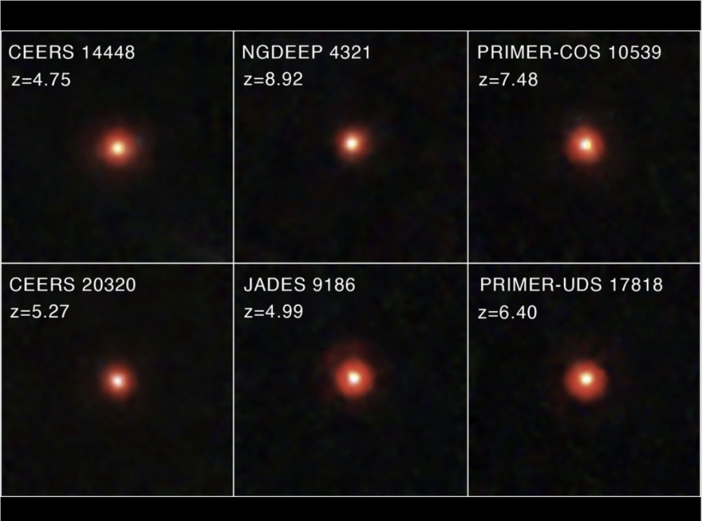 “Quando surgiram as primeiras imagens, acreditava-se que aqueles pontos vermelhos difusos fossem galáxias muito antigas, da época da reionização do Universo, algumas centenas de milhões de anos após o seu início.”