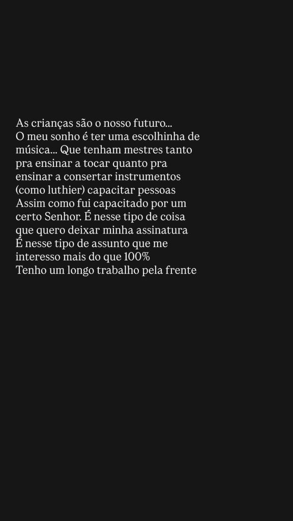 Em seguida, o cantor falou sobre o sonho de iniciar uma escola de música para crianças: “As crianças são o nosso futuro… O meu sonho é ter uma escolinha de música… Que tenham mestres tanto pra ensinar a tocar quanto para ensinar a consertar instrumentos (como luthier) capacitar pessoas assim como fui capacitado por um certo Senhor. É nesse tipo de coisa que quero deixar minha assinatura, é nesse tipo de assunto que me interesso mais do que 100%. Tenho um longo trabalho pela frente”.