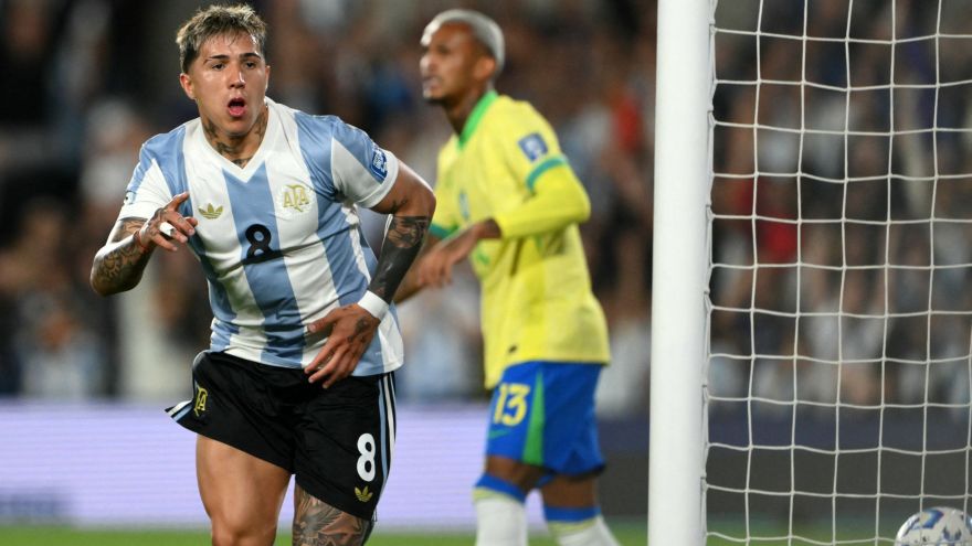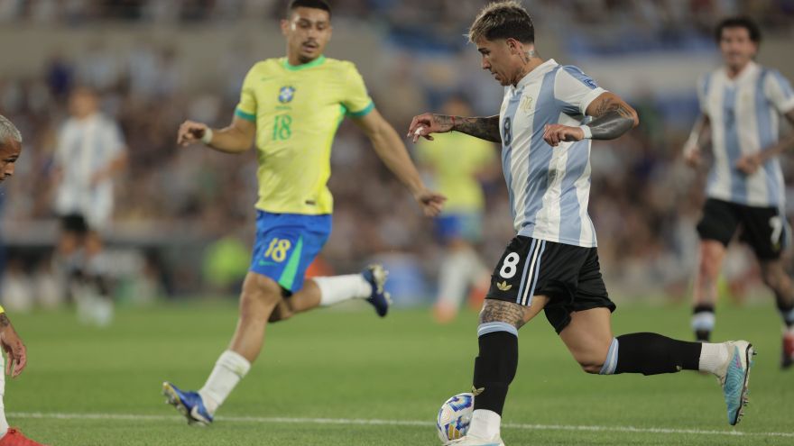 Enzo Fernández marca o segundo gol da Argentina sobre o Brasil • Reprodução/X @Conmebol