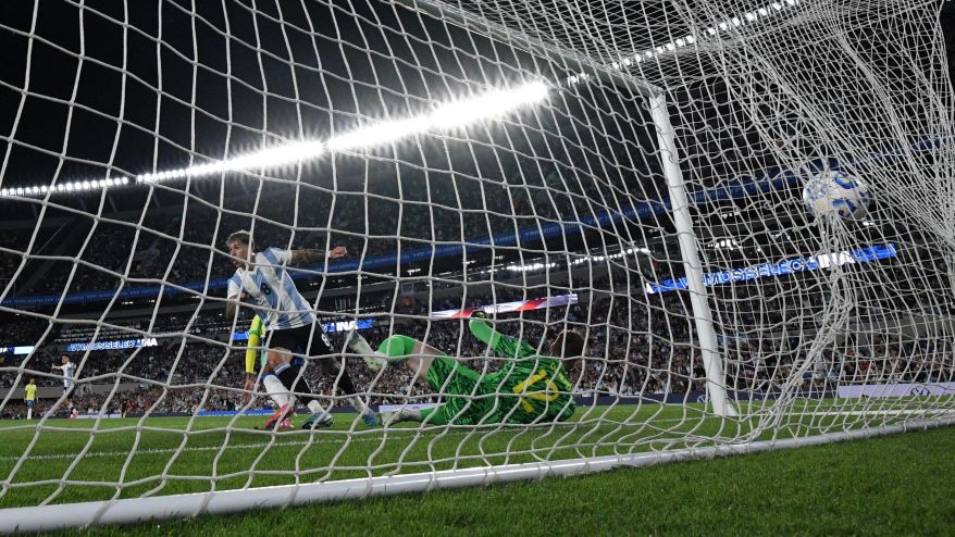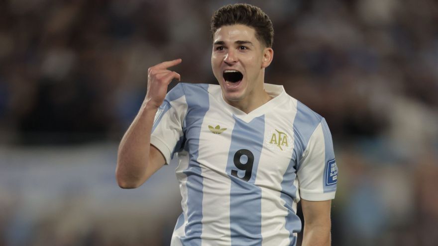 Julián Alvarez comemora o primeiro gol da Argentina sobre o Brasil • Reprodução/X @Conmebol