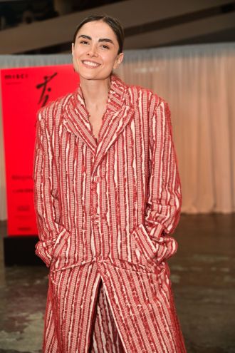 No evento, a renomada atriz surgiu com blazer e calça carmosina em tom marrom, combinados à camisa de seda picadeiro amarela, peças que integram a coleção mais recente da etiqueta, batizada de “Tieta”, e assinada pelo diretor criativo Airon Martin.