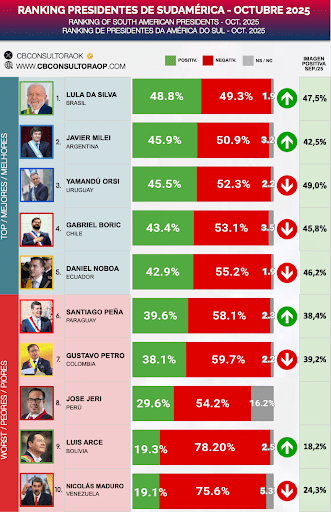 O argentino Javier Milei teve avanço expressivo, subindo do quinto para o segundo lugar, com 45,9% de imagem positiva. Entre setembro e outubro, foi o líder que mais ganhou aprovação, com alta de 3,4 pontos percentuais. Já o presidente da Venezuela, Nicolás Maduro, apresentou a maior queda no período, com recuo de 5,2 pontos em sua avaliação positiva.