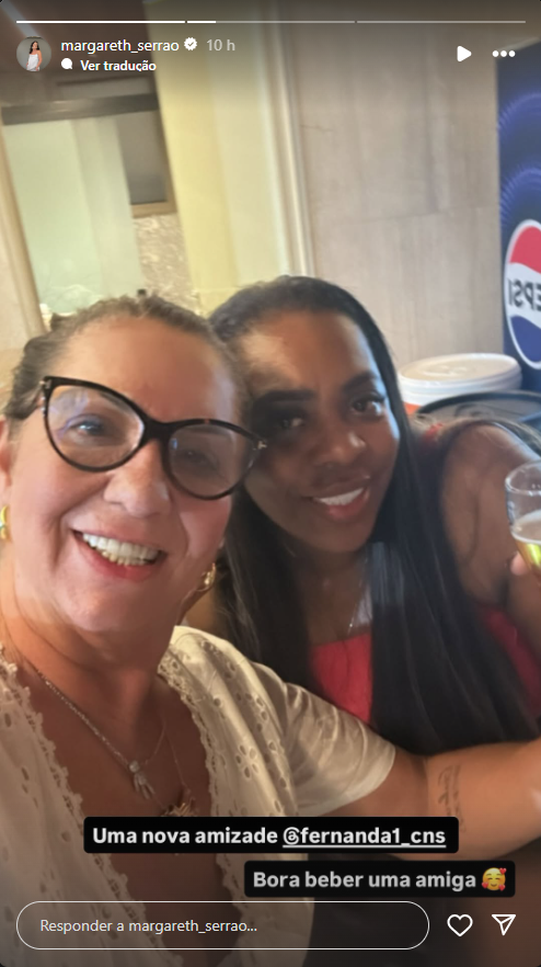 “Uma nova amizade. Bora beber uma amiga”, escreveu Margareth no story do Instagram em que aparece ao lado de Fernanda.