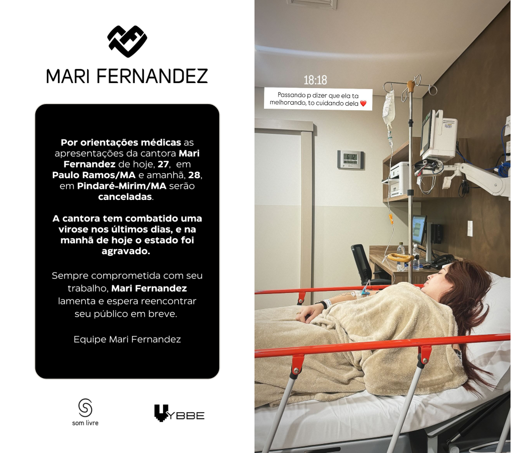 “Por orientações médicas as apresentações da cantora Mari Fernandez de hoje, 27, em Paulo Ramos (MA) e amanhã, 28, em Pindaré-Mirim (MA) serão canceladas. A cantora tem combatido uma virose nos últimos dias, e na manhã de hoje o estado foi agravado”, diz o comunicado publicado em suas redes sociais.