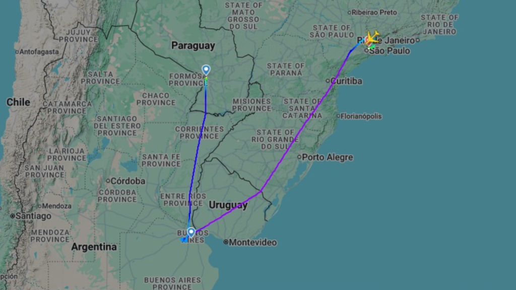 Pelo portal FlightRadar24, que registra o tráfego aéreo, é possível ver a rota que a aeronave fez até pousar em Guarulhos.