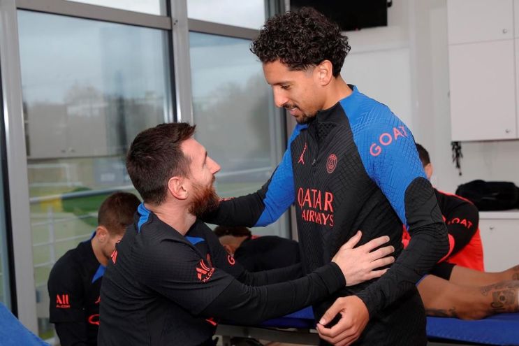 Messi cumprimentou o zagueiro da Seleção Brasileira Marquinhos em sua reapresentação no PSG. • Divulgação/ PSG