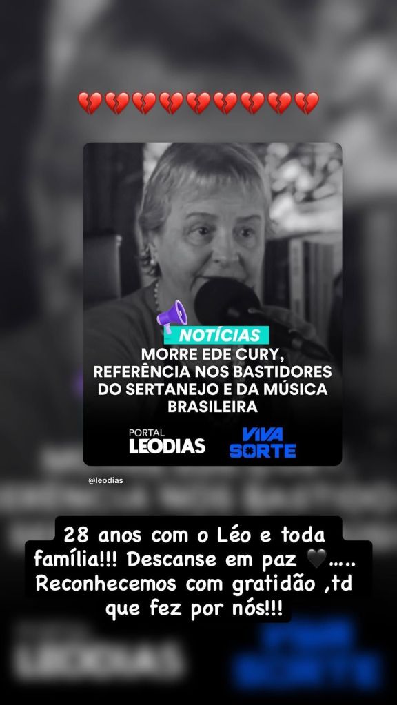 O falecimento foi lamentado nas redes sociais do sertanejo e de sua esposa, Poliana Rocha. “28 anos com o Léo e toda a família. Descanse em paz. Reconhecemos com gratidão tudo o que fez por nós”, escreveu a influenciadora.