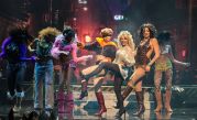 A artista debutou no palco usando um top de franjas e uma minissaia combinando com a parte de cima. Depois, abandonou a peça, revelando um modelito desta vez mais ousado, inspirado em uma lingerie – com sutiã sem alça, shorts curto de lantejoulas e meia-calça brilhante.