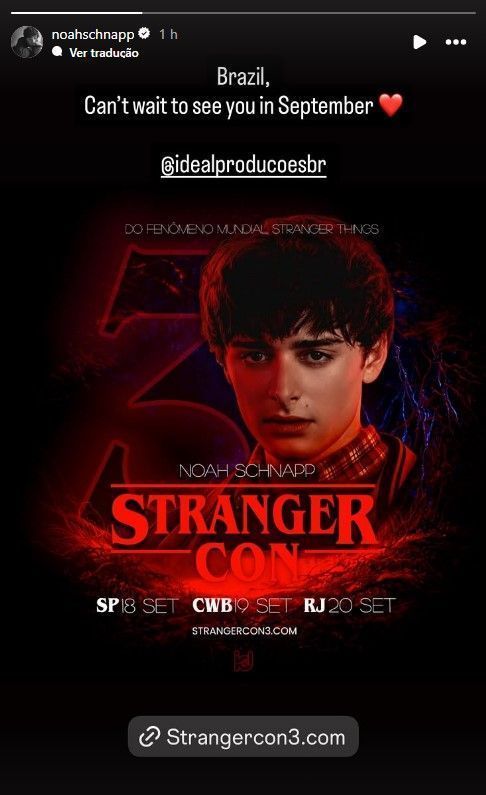 O ator Noah Schnapp, 21, conhecido por interpretar Will Byers na série de sucesso “Stranger Things”, confirmou em suas redes sociais nesta segunda-feira (19) sua participação na próxima edição da “Stranger Con” no Brasil.