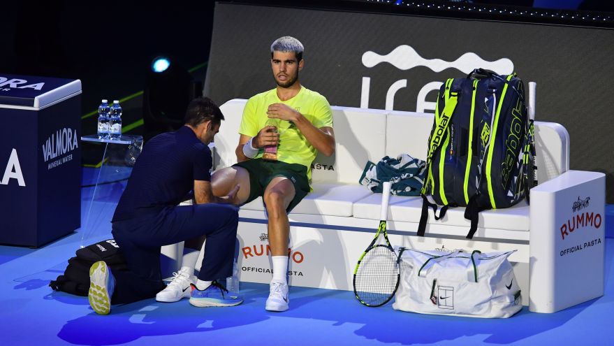 Carlos Alcaraz recebendo atendimento médico durante a decisão do ATP Finals • Valerio Pennicino/Getty Images