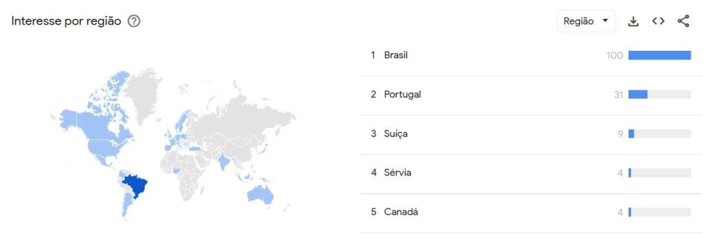 O Brasil liderou as pesquisas realizadas na plataforma, seguido por Portugal, Suíça, Sérvia e Canadá.