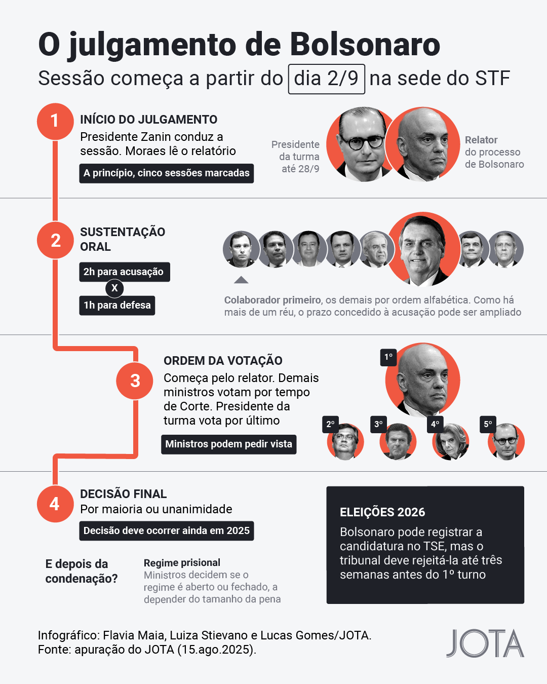 Começa nesta terça-feira (2/9) o julgamento do ex-presidente Jair Bolsonaro e de outros sete réus por tentativa de golpe de Estado. A ação penal 2668 tramita no Supremo Tribunal Federal (STF) sob relatoria do ministro Alexandre de Moraes e está prevista para ocorrer ao longo desta e da próxima semana. O JOTA fará uma cobertura ao vivo do julgamento de Jair Bolsonaro ao longo destes dias. Acompanhe!