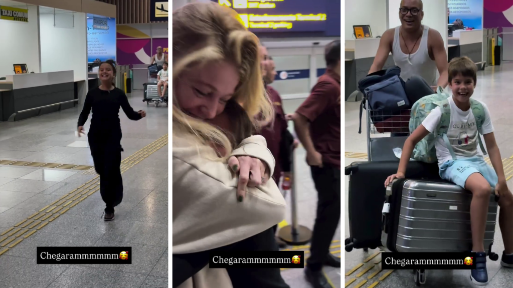 Primeiro, Scooby mostrou, nos stories do seu Instagram, os dois correndo no aeroporto para abraçar a madrasta, Cintia Dicker, 38.