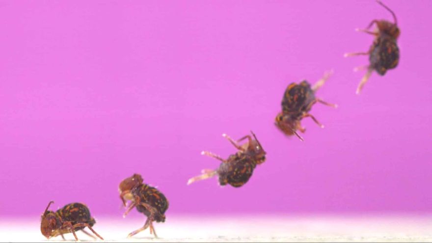 5 de 10Colêmbolo globular, um tipo de inseto que consegue dar cambalhotas para trás no ar, girando mais de 60 vezes a altura do seu corpo em um piscar de olhos. Eles podem atingir uma taxa máxima de 368 rotações por segundo • Adrian Smith